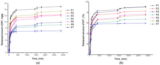 The MT release kinetics from synthesized films expressed in terms of mg/g (a) and released efficiency (b).