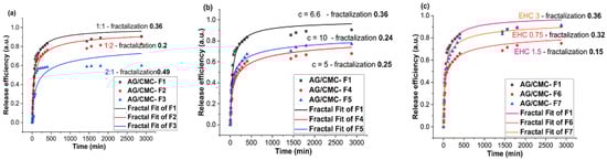 Comparative plots of fractal fits for different release kinetics: (a) F1, F2, F3 films, (b) F1, F4, F5 films, (c) F1, F6, F7 films.