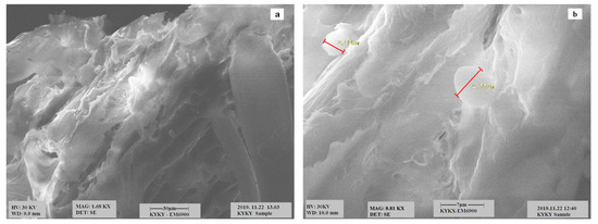 SEM images of the corncob under magnification of 1.68K× (a) and 8.81K× (b).
