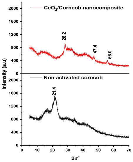 The XRD patterns of corncob and CeO2/corncob are represented in Figure 4. The XRD graphs demonstrate that there is a significant change in the structure of corncobs before and after presence of CeO2. The bulk of the X-ray signal originated from the corncob substrate in 2θ = 21.4° matched well with the previous literature reported by [29]. The XRD of the CeO2/corncob nanocomposite shows three diffraction peaks at 2θ angle = 28.2°, 47.4°, and 56.0°. The absence of sharp peaks confirms the amorphous nature of the CeO2/corncob nanocomposite.