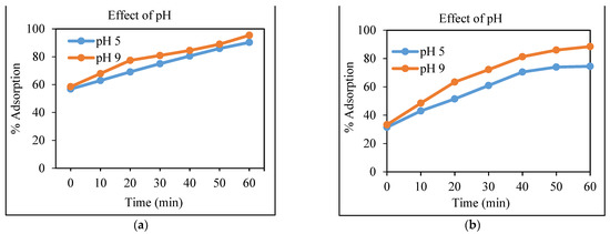 A key controlling parameter in the bio-sorption process of toxic substances from an aqueous solution is the pH because, during the reaction, it affects the concentration of the counter ions on the functional groups of the adsorbent, the degree of ionization of the adsorbate, and the solubility of the ions [30]. To examine the effect of the pH on the adsorption of Cd and Cr, the experiment was carried out at two varying pH, including mildly acidic (pH 5) and mildly alkaline (pH 9). According to the results given in Figure 5a,b, the adsorption process is quite rapid in both acidic and basic pH, but, as the pH changed from 5 to 9, the percentage removal of Cd and Cr increased. The maximum percentage removal at pH 9 was found to be 95% and 88% for Cd and Cr, respectively, as Okorie et al. [28] reported that the percentage removal of Pb(II) and Cd(II) on the adsorbents increased with an increase in pH. As the pH increased from 2 to 8, the percentage removal of the Pb(II) increased from 14% to 99%; similarly, the adsorption of the Cd(II) increased from 13% to 86% as the pH increased from 2 to 8. As the pH value increased, the H+ ions in solution decreased, while H- ions increased; then, the competition between the metals and H+ ions for the active sites of the adsorbents also reduces, which leads to an increase in percentage removal of the adsorbent [31]. From this study, we know that pH significantly affects the adsorption of Cd and Cr by the corncob nanocomposite. The results demonstrate that a maximum removal of chromium was found at pH 9.
