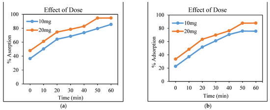 The adsorbent dose plays an important role to determine the capacity of an adsorbent for the concentration of the adsorbate. To study the effect of the adsorbent dose, varied doses were used for the removal of Cr and Cd. According to the results presented in Figure 6a,b, it is demonstrated that, as the adsorbent dose increases, the percentage removal of the adsorbate also increases. The same findings have been reported by Garg et al. [19]: the percentage adsorption of the adsorbate increased with an increase in the dose of the adsorbent. As the dose of the adsorbent increases, it certainly enhances the number of adsorption sites and thus increases the surface area of the adsorbent [32]. It can be concluded from the results that the optimum dose is 20 mg because the maximum removal is 95% for Cd and 88% for Cr.