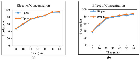 The purpose of this experiment was to investigate the effect of initial concentration on the adsorption of heavy metals (Cd and Cr) on the CeO2/corncob nanocomposite. In this study, to investigate the effect of the adsorbate’s initial concentration, two adsorbate concentrations were chosen, namely 10 ppm and 20 ppm. According to the experimental results given in Figure 7, it can be concluded that the adsorption process increases with an increase in the adsorbate’s concentration, which mainly occurs because of the increase in the number of adsorbent sites and of the adsorbate particles. The adsorption capability increased as the concentration of adsorbate increased. That is because, at low concentrations, the ratio of the initial number of heavy metal molecules to the available surface area is low. At a high concentration, the ratio is higher because there are fewer available sites, so the removal rate of heavy metals depends upon the concentration. The same trend has been observed in the adsorption of carbaryl treated with eggshells [33]. Our results are also in agreement with [34], which explains that the percentage removal of Cr, Cd, and Cu metal ions was increased with an increase in the concentration.