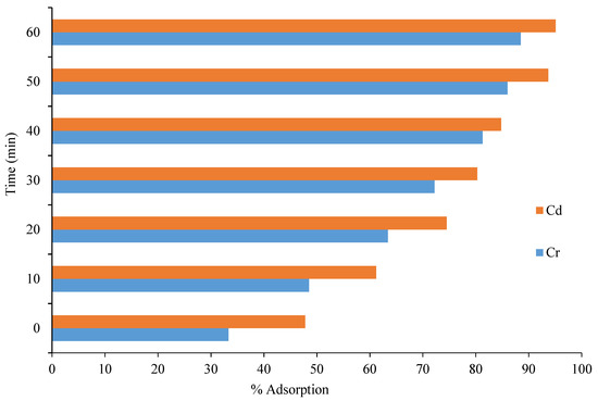 The effect of contact time on the adsorption of Cd and Cr was investigated to determine the maximum time taken to attain the equilibrium. The effect of contact time was examined over the range of 0–60 min. It can be observed from the results, shown in Figure 8, that, as the contact time increased, the percentage removal also increased, which might be due to the availability of active sites in the adsorbent. The removal of Cd increased from 47.8% to 95.5% as the time increased from 0 to 60 min; the removal of Cr increased from 33.3% to 88.5% as the time increased from 0 to 60 min, at a shaking speed of 120 rpm. Overall, the percentage removal for both Cd and Cr increased as the contact time increased from 0 to 60 min.