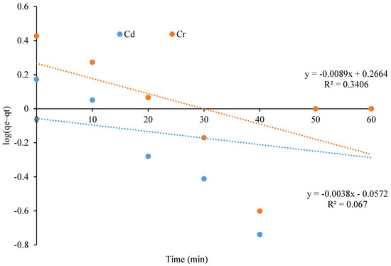 Figure 9 represents the plot of log (qe − qt) versus t. The regression values show that the fitness of the model is not applicable for Cd and Cr. The results obtained by [34] also revealed that the value of R2 for the pseudo-first-order model was poor, which demonstrated an unfit model for the adsorption of heavy metals.