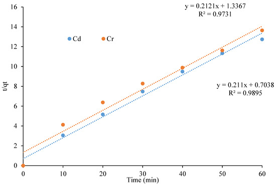 where k2 (min/mg) is the rate constant of the pseudo second order and qe is the amount adsorbed at equilibrium (mg/g). The plot of t/qt versus t gave a straight line for Cd and Cr with R2 values of 0.9895 and 0.9731, respectively. The experimental data were found to be in excellent agreement with the pseudo-second-order model (see Figure 10). The same results have been reported by [36]: the adsorption data for Cd and Cr were well fitted with the pseudo-second-order model. It is assumed that the adsorption mechanism follows chemisorption; the kinetics is fast; and the efficiency of each material is well suited to the model.