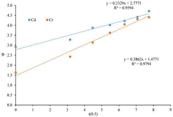Figure 11 shows the plot of qt vs. t 0.5. The values obtained for R2 were 0.9594 for Cd and 0.9794 for Cr, which suggests that the intra-particle diffusion model supports the adsorption of Cd and Cr. As the line did not pass through the origin, it shows that the intra-particle diffusion was not the only rate-controlling step, but other processes also involved the sorption process [38].