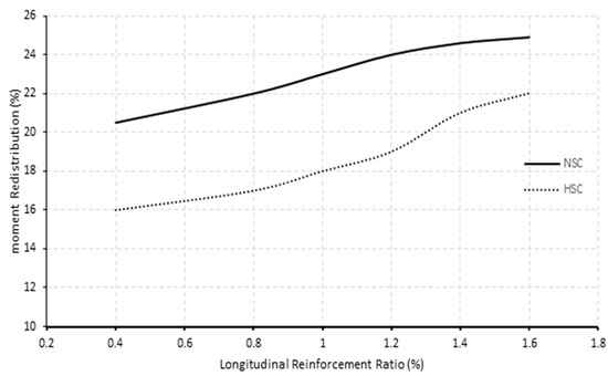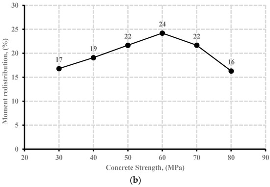 - The increase in concrete strength resulted in an enhancement in moment distribution. The behavior was limited only to beams that had a concrete strength not exceeding 60 MPa. High-strength concrete specimens with concrete strengths more than 75 MPa generally distributed less moment than their normal strength concrete counterparts.