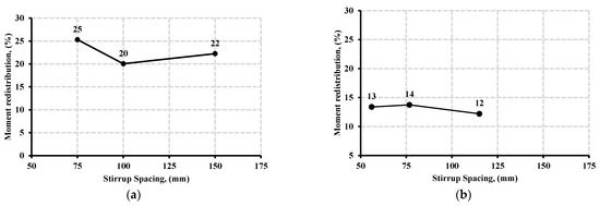 - Stirrup spacing impacted the moment redistribution in continuous beams. However, its ability to influence moment redistribution seemed to diminish with high concrete strengths. In addition, the relationship between spacing and moment redistribution was not directly proportional. Reducing the shear reinforcement ratio by reducing the stirrups’ spacing while maintaining constant stirrup diameter did not always enhance moment redistribution.