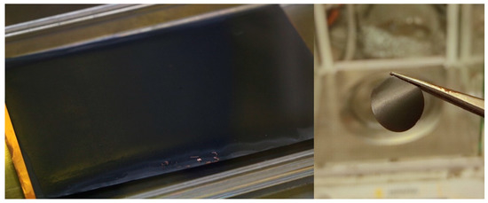 The monomer mixtures were polymerized directly onto the surface of the electrode that was used. Therefore, the electrode or aluminum foil were fixed on a plain glass plate. A thin layer of the monomer mixture was applied using a doctor blade with a fixed gap of 200 μm. The doctor blade was filled with the monomer mixture and drawn slowly (approximately 15 cm·min−1) over the electrode sheet. Due to the relatively low viscosity of the monomer slurries, the suspensions did spread out on the electrode surfaces. Therefore, the final monomer layer thickness is well below 200 µm. The glass plate with the coated electrode sheet was immediately placed within the UV-chamber and exposed for 40 min. Figure 2 shows an example of a graphite sheet coated with composite polymer electrolyte in the format of approximately 8 × 12 cm and a coated, punched-out NMC electrode with a diameter of 16 mm.