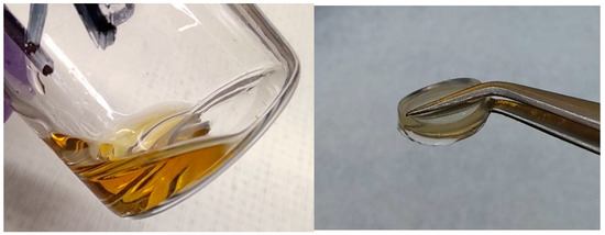 P[C8NA,22]TFSI polymer mixture with additional 45 wt % MPPyrr-TFSI and without cross-linker (left) same P[C8NA,22]TFSI polymer mixture (PIL_6_7) with additional 2.5 wt % of cross-linker (right).