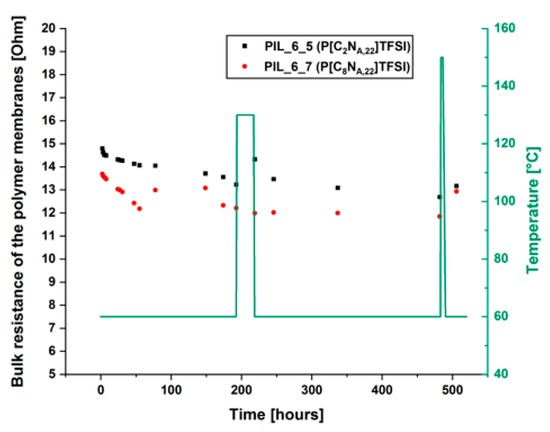 Change of the composite electrolyte membranes bulk resistance under thermal stress. Post-mortem membrane thicknesses of the samples are 99 μm for PIL_6_5 and 61 μm for PIL_6_7.