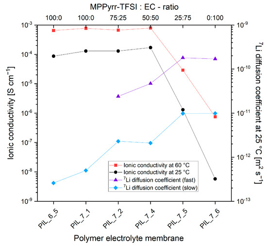 The influence of the liquid electrolyte composition on the ionic conductivity values and 7Li diffusion coefficients are presented graphically in Figure 5.