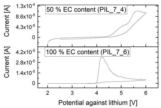 Figure 8 shows the CV measurements of the examined membranes with 50% EC and 100% EC content in the liquid electrolyte, respectively. At room temperature, the polymer electrolyte stability against lithium occurs to be sufficient for the operating range, even with NMC and lithium as electrode materials. At elevated temperatures, the electrochemical stability may decrease, resulting in side reactions. For the polymer mixture without MPPyrr-TFSI and 100% EC content, the voltage stability decreases to 4 V against lithium. The cell tests with this material are only discussed with LFP and LTO as electrode materials, since voltage range during cycling lies within the stability window.