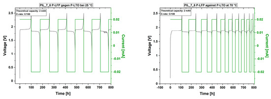 First 10 cycles of the cell test of the polymer electrolyte with 100% EC as liquid electrolyte (PIL_7_6) at 25 °C (left) and 70 °C (right) and lithium iron phosphate against lithium titanate electrodes at C/100. Images including all executed cycles are given in the Supporting material section (Figure S6).