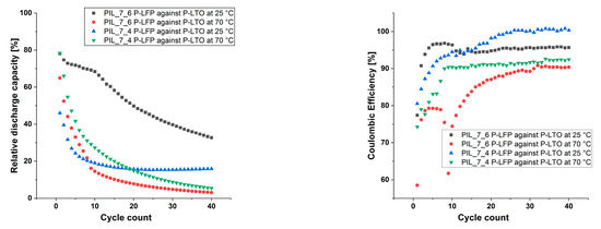 From the PFG-NMR results, it can be derived that a higher EC content could lead to better cell performance due to higher lithium ion mobility, even at lower ionic conductivity values. An ionic conductivity of at least 10−4 S·cm−1 at room temperature, as the literature claims, is therefore not a sufficient characteristic for the studied PIL materials to ensure sufficient lithium ion mobility. Moreover, it is necessary to ensure a sufficient mobility of the lithium ions and the compatibility of the polymer electrolyte materials with the electrodes. For this purpose the P[C8NA,22]TFSI membranes with 50% EC (PIL_7_4) and 100% EC (PIL_7_6) were polymerized directly on the active material foils (except for lithium metal) and cycled as full cells in a coin cell format. Two electrode combinations were used: