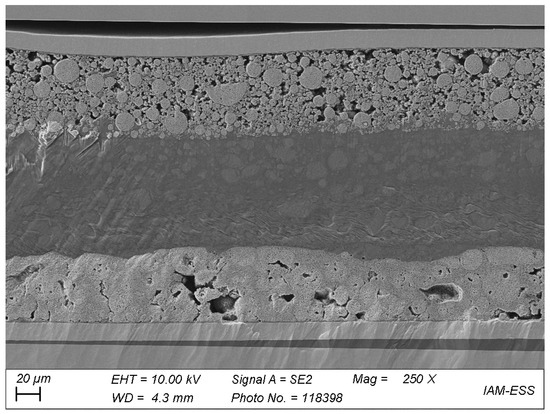 The fact that the cells did not fail in terms of a voltage breakdown, although they show strong aging effects, indicate that the mechanical aspect of the membrane is not limiting the material. This assumption was proven by scanning electron microscopy (SEM) of a post-mortem cell stack of the cell with PIL_7_6, which was cycled at 70 °C over almost 60 days. Figure 11 shows a cross-section of the stack with the LFP electrode on top of the LTO electrode.