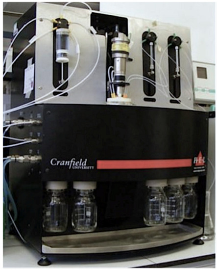 Synthesis of nanoMIPs was performed using an automated synthesizer (see Figure 1 and Figure 2), which was manufactured by HEL Ltd., Borehamwood, UK. It consisted of a temperature-controlled column reactor packed with glass beads bearing the immobilized template. The column consisted of a sliding lid mechanism, which included all inlets and a stirring system. The internal temperature of the reactor was controlled with a dual heating system and monitored via an internal thermocouple fitted in the lid. A set of pumps delivered the monomer mixture, initiator, additional solutions for post-derivatization, and washing and elution solvents, while on the outlet, a fraction collector separated waste streams from high-affinity product fractions. It is also possible to perform post-derivatization of nanoMIPs with different compounds in a solution. The machine also included an N2 inlet to flush the reactor before the polymerization and to force out the liquid and empty the reactor under positive pressure. All the parameters and components of the reactor were controlled by a computer and a suitable software (WinISO) and were able to be programmed in advance by the operator.