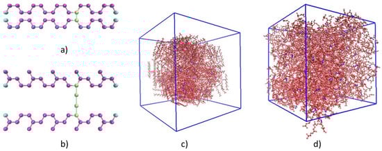 where and denote the total numbers of crosslink bridges and monomer units, respectively. The molecules were randomly distributed in a periodic supercell with the Packmol [31] software (see, as an example, Figure 1c).