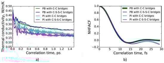 In Figure 3b, the dependence of thermal conductivity on the degree of crosslinking for vulcanized polybutadiene with randomly distributed C-S-S-C crosslink bridges is presented. The modeled vulcanized polybutadiene consists of 16 chains composed of 190 monomer units connected by randomly distributed C-S-S-C crosslinking bridges. It is obvious in Figure 3 that the type of distribution (random or uniform) of the crosslinking bridges does not significantly influence the final thermal conductivity. Due to that, only models of vulcanized polybutadiene and polyisoprene with uniformly distributed crosslinking bridges were considered in this research.