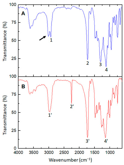 Both spectra confirmed the presence of sulfonyl and nitrile functional groups in the respective polymethacrylates, which are responsible for the outstanding dielectric properties reported by these materials. The presence of sulfonyl groups can be demonstrated from signals labeled as 3 and 4 in Figure 1A, centered at 1313 and 1127 cm−1, respectively, representing the asymmetric and symmetric vibrations of S–O double bonds [1,7,29]. Moreover, the signal pointed out by a black arrow (3013 cm−1) would be assigned to the vibration of the methyl group directly bonded to the sulfur atom [29]. On the other hand, Figure 1B reveals the presence of nitrile groups in PCNMA and PCNMA−RAFT through the signal 2′ centered at 2255 cm−1 [4,5,24,30]. Regardless of the above, other characteristic vibrational bands for polymethacrylates can be detected. Vibrational modes attributed to CH2 and CH3 (signals 1 and 1′) appear at 2950 cm−1, signals 2 and 3′ observed at 1730 cm−1 are related to the stretching of carbonyl groups, and finally, signal 4′ detected in Figure 1B represents the stretching mode of O–C–O bonds belonging to ester groups [1,7,31,32]. This last signal, centered at 1147 cm−1, cannot be observed in Figure 1A, probably due to its overlap with sulfone vibrational bands.
