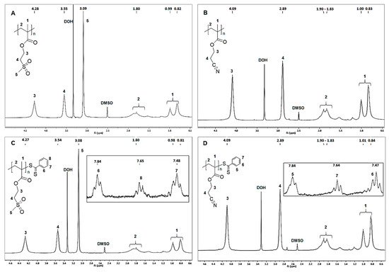 1H-NMR spectra of both polymethacrylates polymerized conventionally (A,B) and by RAFT methodology (C,D). DMSO-d6 used as solvent.