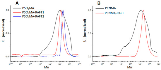 Size-exclusion chromatography (SEC) traces obtained for PSO2MA (A) and PCNMA (B) polymerized by both methodologies.