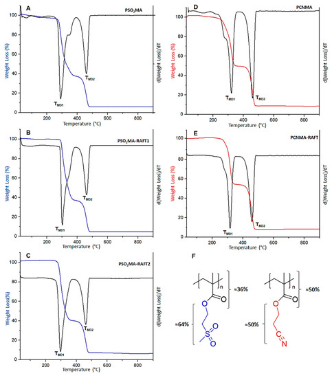 Concerning the shape of thermograms shown in Figure 4, it can be seen that all polymethacrylates, independently of their molecular weight and dispersity, exhibit a roughly two-step degradation process. The above has been analyzed and discussed by previous authors [1,29], including our group [7,20], assigning the first decomposition process mainly to the cleavage of pendant groups, while the second step would be ascribed to the volatilization of species arising from the random fragmentation and depolymerization of the polymer backbone remaining from the first step. For this first degradation step, the area analysis performed on DTGA curves reveals a mass loss percentage of around 61%, 63%, and 61% for PSO2MA, PSO2MA−RAFT1, and PSO2MA−RAFT2, respectively, whereas for PCNMA and PCNMA−RAFT values of 49% and 46% were calculated. These values show a good correlation with the mass percentage of pendant groups pointed out in Figure 4F. Furthermore, as our group has previously reported for both polymethacrylates, the FTIR analysis of residues obtained after the first decomposition presents the total absence of sulfonyl and nitrile bands [7]. In contrast, other bands assigned to the polymer main chain remain in spectra.