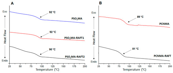 DSC analysis of polymethacrylates containing sulfonyl (A) and nitrile (B) groups. Tg values are indicated by black arrows.
