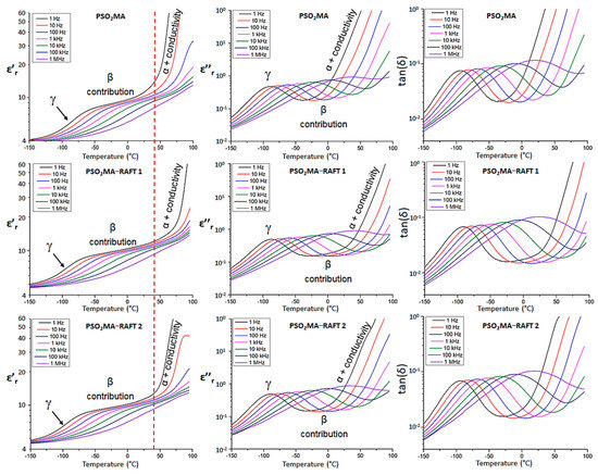 Evolution of ε’r, ε”r and tan(δ) with the temperature at different frequencies for PSO2MA, PSO2MA−RAFT1, and PSO2MA−RAFT2.