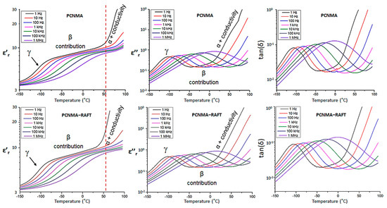 Evolution of ε’r, ε”r, and tan(δ) with the temperature at different frequencies for PCNMA and PCNMA−RAFT.