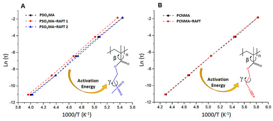 The activation energy of γ transitions represent the energy barrier that sulfones or nitriles, need to overpass to change their orientation and contribute to the polarization of the material. Besides, the magnitude of this barrier should be directly influenced by the surrounding media of dipoles. In this sense, for a same type of dipolar group, any change in the measured value of its activation energy could be attributed to variations in its local environment. From the slopes of the linear fits exposed in Figure 8A, values of 0.56, 0.57, and 0.56 eV were calculated for sulfones movements in PSO2MA, PSO2MA-RAFT1, and PSO2MA-RAFT2, respectively. Similarly, from Figure 8B, nitrile motions in both PCNMA and PCNMA-RAFT exhibit values of 0.52 eV. The previous result suggests that, within the explored range, changes in the molecular weight of these polymers do not alter the energy barrier, and consequently, the kinetic behavior of sulfones and nitriles motions. Thereby, since the dielectric constant of obtained materials depends on these dipolar motions, but these motions are not affected by changes in their molecular weights, values in Table 4 find a plausible explanation. Additionally, it is important to mention that values calculated in this work are in good correlation with those previously reported [1,7]. Higher values have been again obtained for sulfonyl-containing polymethacrylates. This has previously been attributed to the stronger dipole–dipole interactions and greater steric hindrance that sulfone groups exhibit regarding nitriles. Lower values mean that dipole rotations require lower thermal energy to be activated. Thereby, since nitrile groups start to move at lower temperatures than sulfones (see Table 5), polymethacrylates containing the first entities will reach a polarized state earlier on the temperature scale.