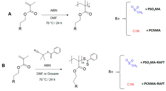 The synthesis of poly(methacrylate)s was carried out with AIBN as radical source and 2-cyano-2-propyl benzodithioate (2CPBz) as RAFT agent [29]. Briefly, for PCNMA-RAFT, 2.7 g of CNMA, 21.5 mg of 2CPBz, and 1.5 mg of AIBN were solubilized in 1 mL of DMF and placed in a Schlenk tube equipped with a magnetic stirrer. For poly(methacrylate)s containing sulfonyl groups, two samples of different molecular weight were prepared, labelled as PSO2MA-RAFT1 and PSO2MA-RAFT2. PSO2MA-RAFT1 was prepared from 2.0 g of SO2MA, 5.9 mg of 2CPBz, and 0.4 mg of AIBN, while PSO2MA-RAFT2 was prepared from 2.0 g of SO2MA, 13 mg of 2CPBz, and 1.3 mg of AIBN. In each case, reagents were solubilized in 1 mL of dioxane and placed in a Schlenk tube equipped with a magnetic stirrer. All pre-polymerization mixtures were subjected to five freeze-pump-thaws cycles and finally purged with dried N2. Polymerizations were carried out at 70 °C and under constant magnetic stirring for 24 h, after which each polymerization mixture was poured over an excess of cold methanol inducing the apparition of a pink powder. Polymers were purified by three solubilization-precipitation cycles using DMF and methanol as solvent and precipitant, respectively, then soaked in Milli-Q water for two days and dried in a vacuum oven at 120 °C until at a constant weight. Polymerization conversions of 70%, 80%, and 73% were obtained for PCNMA-RAFT, PSO2MA−RAFT1, and PSO2MA−RAFT2, respectively.
