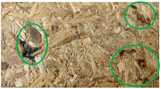 Dark brown spots on the surface of the panels with 50% BSG and 50% wood particles bonded with pMDI.