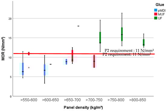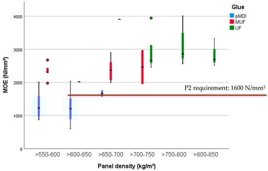The MOR (Figure 5) and MOE (Figure 6) of the tested specimens, measured according to EN 310:1993 [35], are highly significantly (p < 0.001). The eta squared values are highest with glue type (0.75) and density (0.6), and minor influenced by the BSG amount (0.11). MOR (Figure 5 left) was lowest for the panels with a density between 550 and 650 kg/m3 (mostly the boards glued with pMDI), ranging from 7.7 (SD 1.3) N/mm2 for the panels manufactured with 10% BSG to 5 (SD 0.83) N/mm2 for a mixture of 50% BSG and 50% wood particles. The uppermost values of MOR were recorded at higher densities of the UF-bonded panels, from 19.64 (SD 1.09) N/mm2 to 13.21 (SD 0.44) N/mm2. In the middle are the MUF-glued boards, with 10.46 (SD 1.16) N/mm2 for 10% BSG and 11.2 (SD 1.2) N/mm2 for 30% BSG (see densities in Figure 5 left).