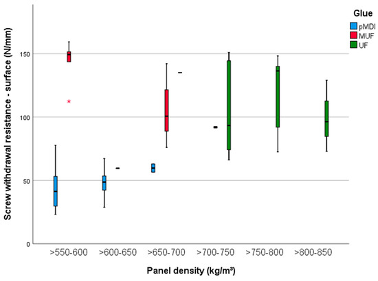 It is accepted by experiments that certain mechanical properties, from that MOE and MOR of wood-based composites are correlated to screw withdrawal resistance, measured according to EN 320:1993 [38]. That means that the same tendencies observed in 3.1 and 3.2 are applicable also for SWR (Figure 7), which is dependent on glue type [39], with a value of eta squared of 0.62 and less influenced on density type (0.3) and BSG amount (0.22). The SWR in the surface measured at the surface of panels glued with UF and with a density up to 850 kg/m3 was between 76 and 143 N/mm and similar to the values obtained for the MUF-glued panels (92 to 116 N/mm). A half of these values were measured for lower density panels (<650 kg/m3) bonded with pMDI (30 to 63 N/mm).