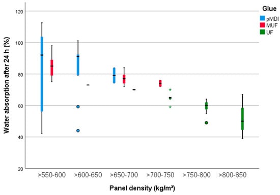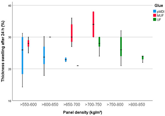 Small variations in the TS 24 h (Figure 8) are attributed to density (8%), BSG amount (13%) and glue type (25%). As a consequence, the panels with the highest density, up to 850 kg/m3, did not swelled in thickness so much as the panels with a density ranged from 650 to 750 kg/m3. The use of pMDI kept the TS 24 h between 17% (SD 1.71%) (samples without BSG) and 30% (50% BSG content, SD 0.8%). The TS of the UF-bonded PB is similar to the one observed for the group glued with pMDI. Slightly higher TS 24 h were measured for the PB manufactured with MUF, with a maximum of 34% (SD 2.65%).