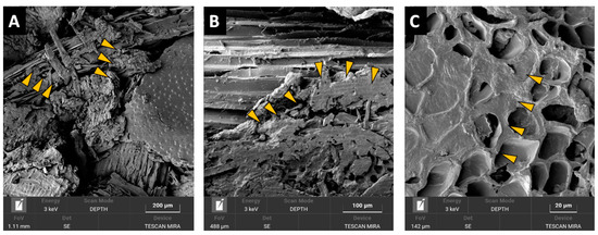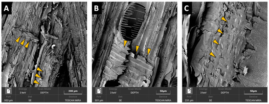 The microscopic evaluation of the different particleboard types (Figure 10 and Figure 11) indicated potential reasons for the mechanical property differences. While structural SEM inspection of a PB made from wood showed mainly structural failures in wood (Figure 10A,B) or failures at the wood-adhesive bond interphase (Figure 10C), these were very seldom observed at the PB containing BSG particles. It was observed that BSG particles, unlike particles of wood, are frequently present in voids and pores within the particleboard structure (Figure 11A), with finer BSG particles also adhering onto wooden particles surfaces (Figure 11B) restricting proper wood particle-particle structural bonding. Furthermore, often BSG particles showed extensive porosity (Figure 11C), causing local overconsumption of adhesive which filled these pores instead of adhering to the particles surface, with the consequence of restricting proper bonding contact among the particles. We assume that aforementioned observations are connected to the actual negative effect of the BSG content on the internal bond strength of the panels.