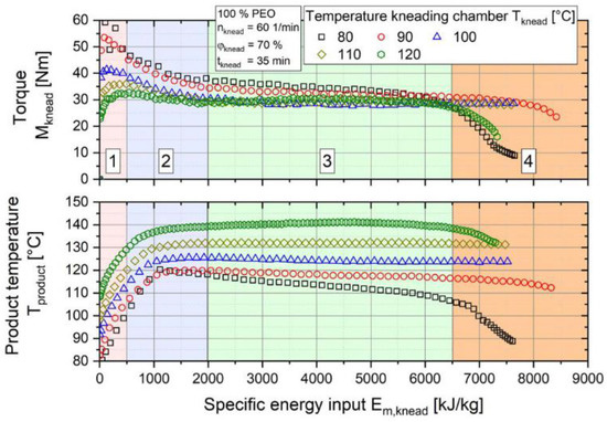 Influence of the processing temperature (Tknead) on the polymer PEO. The composite undergoes four steps: (1) Homogenization, (2) Plasticization, (3) Plasticized homogenization and (4) Degradation. Reprinted with permission of Journal of The Electrochemical Society, 2020, 167, 020558 [50].