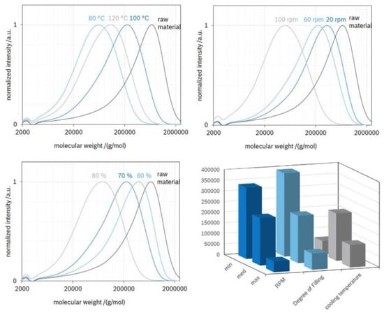 Malik et al. pointed out the effect of temperature on the degradation of a SPE PEO-based blend [53], but Froboese et al. went further as they demonstrated that shear forces and filler content also have an impact on the resultant hybrid polymer electrolyte. Gel permeation chromatography (GPC) measurements on PEO show the chain lengths after different processing parameters and are reported in Figure 7. It reveals that increasing the shear rate as well as the filler content leads to a decrease in PEO molecular weight. This shows that all cited parameters impact the resulting composite and compromises need to be made. The optimal parameters window is very narrow, and polymer degradation should always be considered when the extrusion process is used. Moreover, the results presented for PEO with the tested parameters, will obviously be different for each potential polymer used as a matrix.