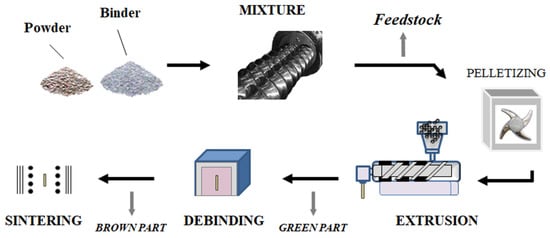 Another example is from Sotomayor et al. who used extrusion to formulate LTO and LFP electrodes without the use of any solvent. This process, which is depicted in Figure 8, comprises the following steps: particle mixing, extrusion, debinding and sintering. The classical binder, PVdF, is replaced by a blend of thermoplastic polymers which can be directly used in extrusion. The blend is composed of polypropylene (PP), paraffin wax and stearic acid (SA) [90]. Ceramic is also added to increase the ionic conductivity of the electrode. The active material, PP, paraffin wax, SA, and ceramic were introduced into the extruder. To maximize the homogeneity of the composite, this step was repeated three times and was then followed by the pelletization of the melt. The pellets were introduced into a single-screw extruder where they were mixed again. After this step, electrode sheets of various thicknesses can be obtained. The polymer blend (PP, paraffine wax, and SA) was then removed from the electrode by heating, which creates pores inside the electrode. A double heating step in n-heptane was required to degrade the polymers. Finally, electrodes were sintered at high temperatures in order to create cohesion between the remaining particles [86]. This study proves that porous electrodes can be made by solvent-free extrusion even if the particle content is high.
