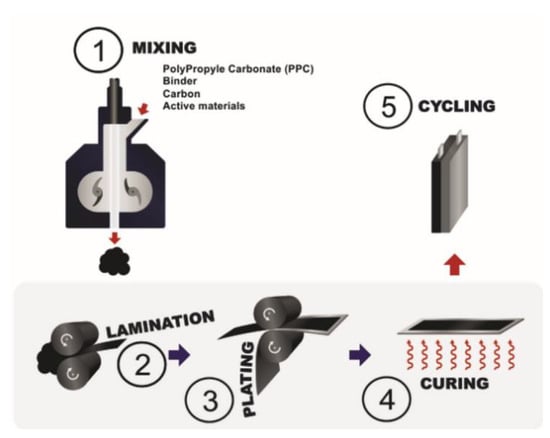 The most recent use of solvent-free extrusion was reported by El Khakani et al. [87] and is based on Hutchinson’s patents [92,93]. In this case, an extruder or an internal mixer can be used and, like in Sotomayor et al. study, PVdF was replaced by an extrudable blend. The latter is composed of polypropylene carbonate (PPC) and hydrogenated nitrile butadiene rubber (HNBR). Figure 9 represents the different steps involved in the process. HNBR and PPC were first introduced into the internal mixer until a homogenous molten blend was obtained. The active material (LTO, LFP or NMC) and conductive carbon were then incorporated into the polymeric blend and mixed until they were properly dispersed. The composite mixture was laminated to form a sheet. This operation was repeated several times until the desired thickness was reached. The electrode was then plated onto a current collector. Finally, the electrode was heated to remove PPC, creating porosity inside the electrode. Astafyeva et al. used the same process to fabricate lithium nickel cobalt aluminum oxide (NCA) cathodes and graphite anodes. The type of binder used in their study is not directly mentioned in their work but they specify that elastomer or thermoplastic binders are used with conductive carbons and at least 90 wt.% of active material [94]. This technique is similar to the one proposed by Sotomayor et al. except that no solvent is needed at any stage of the process. Another aspect highlighted by these two studies is the control of porosity thanks to a polymeric sacrificial phase. It shows the advantage of melt-processing porous electrodes instead of using the classical wet method where porosity is dependent on the solvent.