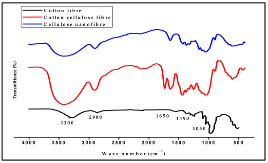 Cellulose nanofibre isolation was confirmed with the FTIR functional group analysis and transmission electron microscopy (TEM). Figure 1 showed the result of the FT-IR analysis of the isolated cellulose nanofibrillated fibre from cotton. The FT-IR graph showed the absorption spectra of a typical bond present in cellulose nanofibrillated fibre. The stretched peak between 3200 to 3500 represents the OH bond, the 2500–3000 cm−1 band represented the C–C bond, and 1500 to 2000 cm−1 the C–H. The peaks at 1050 cm−1 is the C–O stretching vibrations. The band between 400 to 800 cm−1 is often referred to as the amorphous band of the nanocellulose. These peaks are typical of the chemical bonds present in nanocellulose, as reported in the literature [28]. The analysis showed that using the chemical in the isolation process of CNF in this method does not affect the final product’s chemical structure. The FTIR graph showed similarity to those obtained from other methods as reported. The –OH stretch band is observed to reduce absorbance as the raw fibre approach the complete isolation of CNF. There is no indication of a new band after the isolation process of CNF, which indicates that no new bond was formed with the hydrolysis chemicals to produce cellulose (i.e., digestion and bleaching).
