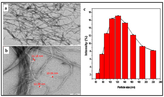 Furthermore, the transmission electron microscopy and fibre size distribution of the isolated cotton cellulose nanofibre is shown in Figure 2a–c. The TEM images of cellulose nanofibre are presented in Figure 2a. The figure showed fibre diameter in the nanosize range between 10 nm and 30 nm, as measured using the TEM software fibre diameter measurement. Further confirmation of the fibre size diameter was done using Image J software. The nanofibre revealed internetworking with each other, as shown in the figure. The result of the particle size distribution of the isolated cellulose nanofibre is presented in Figure 2c. The particle sizes are measured on a percentage scale, and the intensity (%) of each particle size is plotted. The particle size analysis result showed a size range of 60 nm to 220 nm with a peak between 100 nm and 120 nm. The result showed a higher percentage of nanofibre between 100 nm and 120 nm, and this confirms the isolation of cellulose nanofibrillated fibre from textile waste [23,29,30].