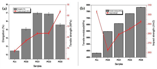 The result of the tensile and impact properties of the neat PLA, PLA/chitin, and PLA/chitin/CNF biocomposite is shown in Figure 3a. The tensile strength of the composite is seen to increase with the addition of cellulose nanofibrillated fibre. The highest tensile strength was obtained with PCC5, while the lowest was the neat PLA. The tensile strength values increased significantly from 47.5 MPa to 83.7 MPa. The increase in the tensile strength showed the effect of nanocellulose reinforcement on the tensile properties. A previous report explained that the increase in tensile strength is due to the addition of CNF with a larger surface area. The CNF increased the polymer mix’s bonding, resulting in a well-arranged internal structure of the biocomposite [18].