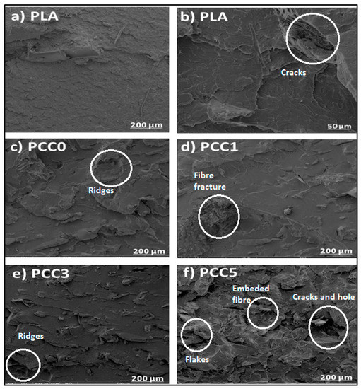 The result of the tensile fractured surface morphology of the neat PLA, PLA/chitin (PCC0), and the PLA/chitin/CNF (PCC1, PCC3, and PCC5) biocomposite is shown in Figure 5. The morphological images showed good miscibility between biopolymers with no segregation. The images showed increased flakes in the biocomposite morphology with the addition of CNF. Additionally, the fractured surface of the biocomposite becomes rougher compared to the neat PLA. This observation means that the biopolymer blends are thoroughly compacted together with no void. This is probably responsible for the high tensile strength and modulus value observed in the mechanical analysis. The changes in the neat PLA’s morphology when chitin and CNF were added can be significantly seen in Figure 5c to f. The SEM images with the addition of chitin only (PCC0) are characterised with wedges and flakes while the addition of CNF (PCC1, PCC3, PCC5) introduced a fibre network in the SEM images. The network of CNF fibres is shown to increase in the images from PCC1 to PCC5. Previous studies on PLA/CNF biocomposite reported agglomeration of CNF in PLA due to differences in nature [17,18], i.e., PLA is hydrophobic, and CNF is hydrophilic. The difference in the nature of PLA and CNF has resulted in poor mechanical properties, as reported in Reference [18].