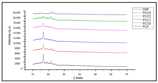 The X-ray diffraction study of PLA and biocomposites showed a typical characteristic of an amorphous polymeric blend with few crystalline peaks between 15° and 23°. The formation of crystallite between material blends may be due to the PLA’s semi-crystalline properties since the neat PLA showed similar peaks [39,40]. However, the XRD result showed lowered peaks with the addition of CNF, which showed that PLA became less crystalline and this resulted in less brittleness of the PLA [41]. The lowered peaks are probably possible because CNF has both crystalline and amorphous parts. The addition of CNF showed that the XRD peaks were further lowered, mainly due to fibre–matrix interaction. With the addition of chitin only (PCC0), the neat PLA peaks seem not to be significantly affected. This is probably reasonable considering the semi-crystalline of chitin. The brittle nature of PLA is one of its limitations and from a previous study, it has been reported that the addition of chitosan often has no lowered effect on the brittle nature of PLA [21]. However, the result of the XRD showed that biocomposite is more amorphous than crystalline [21].