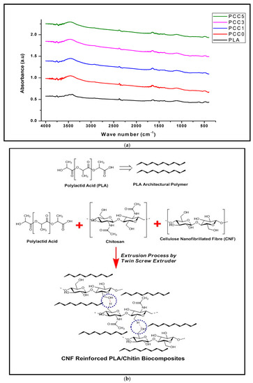 (a) FT-IR analysis of neat PLA, PLA/chitin (PCC0), and PLA/chitin/CNF (PCC1, PCC3, and PCC5). (b) Chemical reaction and bond formation between the PLA/chitin/CNF biocomposite.