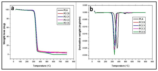 Thermal properties. (a) Thermogravimetry analysis (TGA). (b) Derivative thermogravimetry analysis (DTA) of neat PLA, PLA/chitin (PCC0), and PLA/chitin/CNF (PCC1, PCC3, and PCC5).