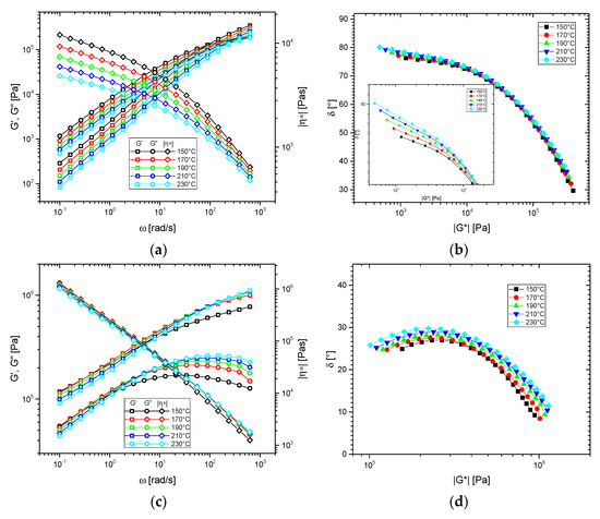 The thermorheological complexity of very high molecular metallocene materials (above Mw = 250,000 g/mol) has not been reported so far to the best of our knowledge. HMW-HDPE shows an almost temperature-independent viscosity function (Figure 2c), while the modulus functions show a temperature dependence, which can be explained with the smaller dynamic range and the temperature and frequency dependence of the phase angle. The δ(|G*|)-plots show that the higher the temperature, the higher is the phase angle δ of the peak around 27°, which occurs before the minimum in the δ(|G*|)-plot, which is outside the measurement range, but has to be present in the measurement data, according to experiences with similar materials [52,53,55]. In the case of HMW-HDPE, this minimum and the following upturn towards δ = 90° is located at too small frequencies to be measured within a reasonable time (>1 day). Taking this somewhat different curve shape into account, it can be concluded that otherwise, HMW-HDPE thermorheologically behaves just like a BL-material (LCB-mPE) according to the thermorheological complexity classification scheme [58].